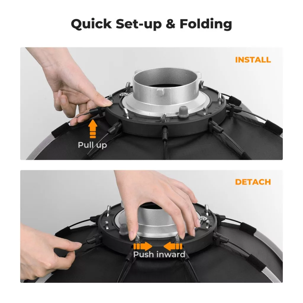 - Bowens Gyorskioldó Rendszer: Gyors és egyszerű beállítás, kompatibilitás a Bowens mounttal rendelkező eszközökkel.
