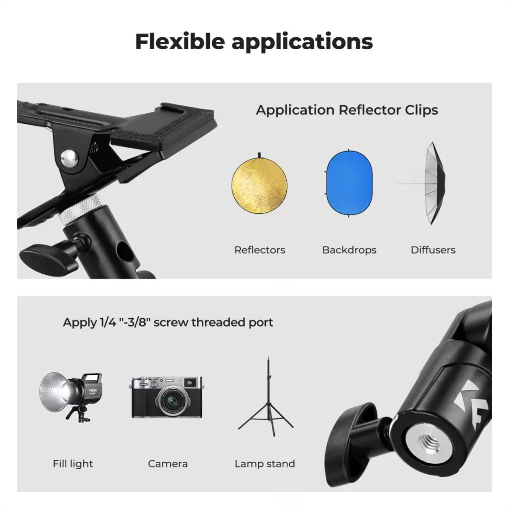Ideális választás fotósoknak, videósoknak és stúdióhasználóknak, akik szeretnék stabilan és pontosan rögzíteni derítőlapjaikat vagy világítási kiegészítőiket.