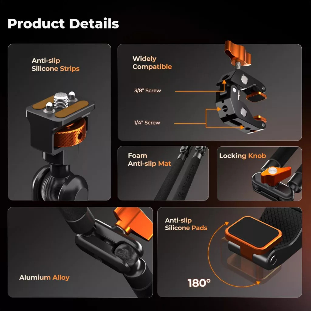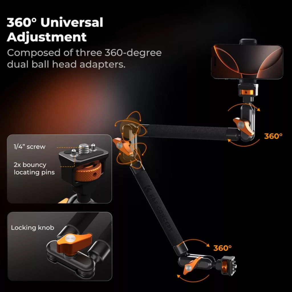 A K&F Concept 22" magic arm clamp egy sokoldalú, asztalra rögzíthető kameratartó rendszer, amely ideális választás overhead felvételekhez, videózáshoz és tartalomgyártáshoz. A hosszú, flexibilis kar lehetővé teszi a kamera pontos pozicionálását, így könnyedén beállítható a kívánt szög és magasság. A stabil asztali rögzítő biztos tartást nyújt, így a felszerelés biztonságosan használható munka közben.