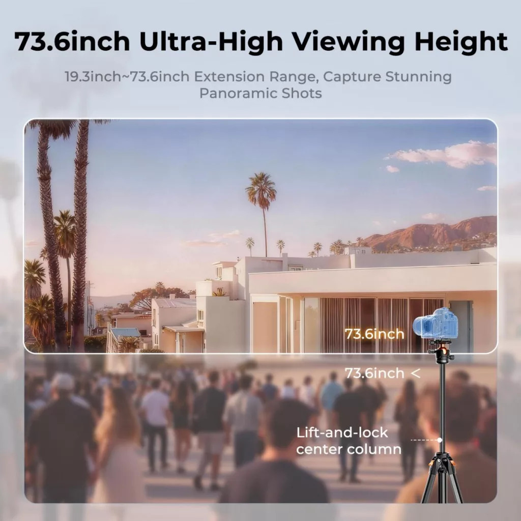Könnyű és kompakt alumínium állvány 73" maximális magassággal, amely stabil tartást biztosít fényképezőgépek és okostelefonok számára. Hordozható kialakítása ideális utazáshoz és kültéri használatra, megbízható megoldás fotózáshoz és videózáshoz egyaránt.