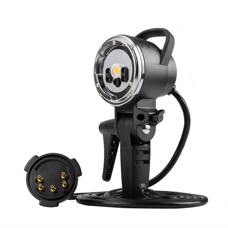 The compact and light AD-H600B is powered by the battery of the master flash and therefore has a cable with a length of 2.75 meters. Thanks to the Bowens mount, using accessories such as an optional softbox or reflector is very easy. The ten Watt LED modeling lamp can be switched on or off as desired. This 600ws head is easy to tilt and has a spigot connection at the bottom for placement on a lamp tripod. The power cable has a length of 2.75 meters.