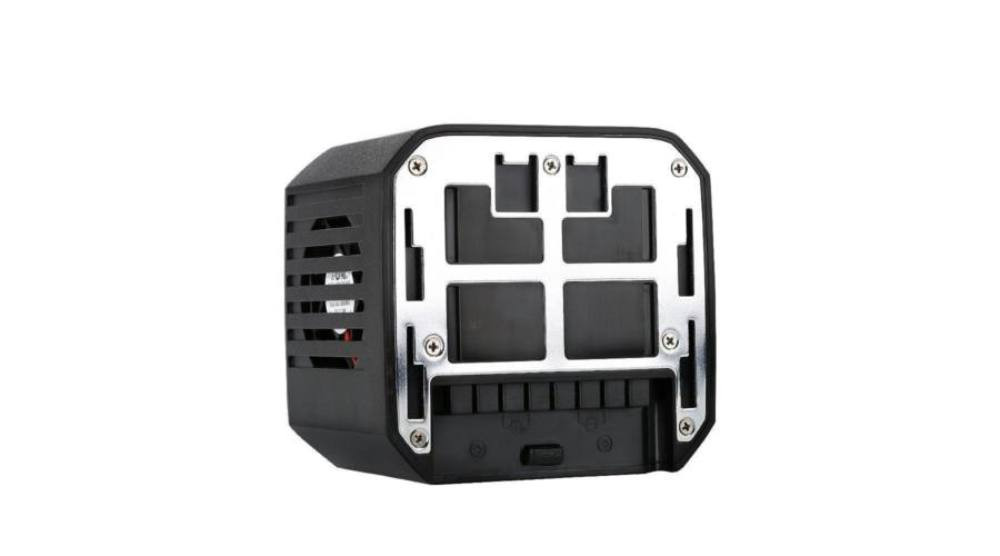 The AC adapter has a built-in temperature-controlled fan that switches on and off automatically. This keeps the adapter cool, even under heavy loads. With the large red toggle switch on the back you can turn the lamp on and off.