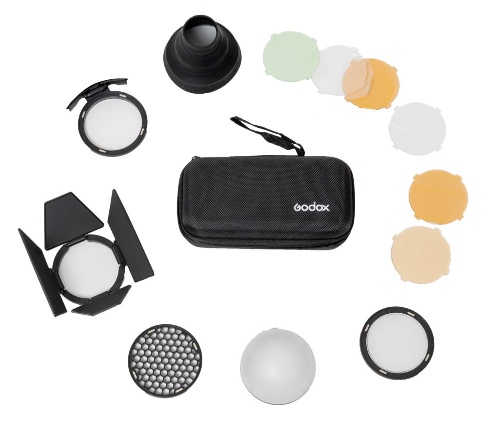 The Godox Accessories Kit AK-R1 for H200R Head is an accessories kit for the H200R. The kit consists of various parts to adjust the light effect. The kit consists of a diffusion ball, various color filters, a honey comb and a snoot. Via the magnetic connection on the H200R, the accessories are easy to attach by clicking them on, as it were.