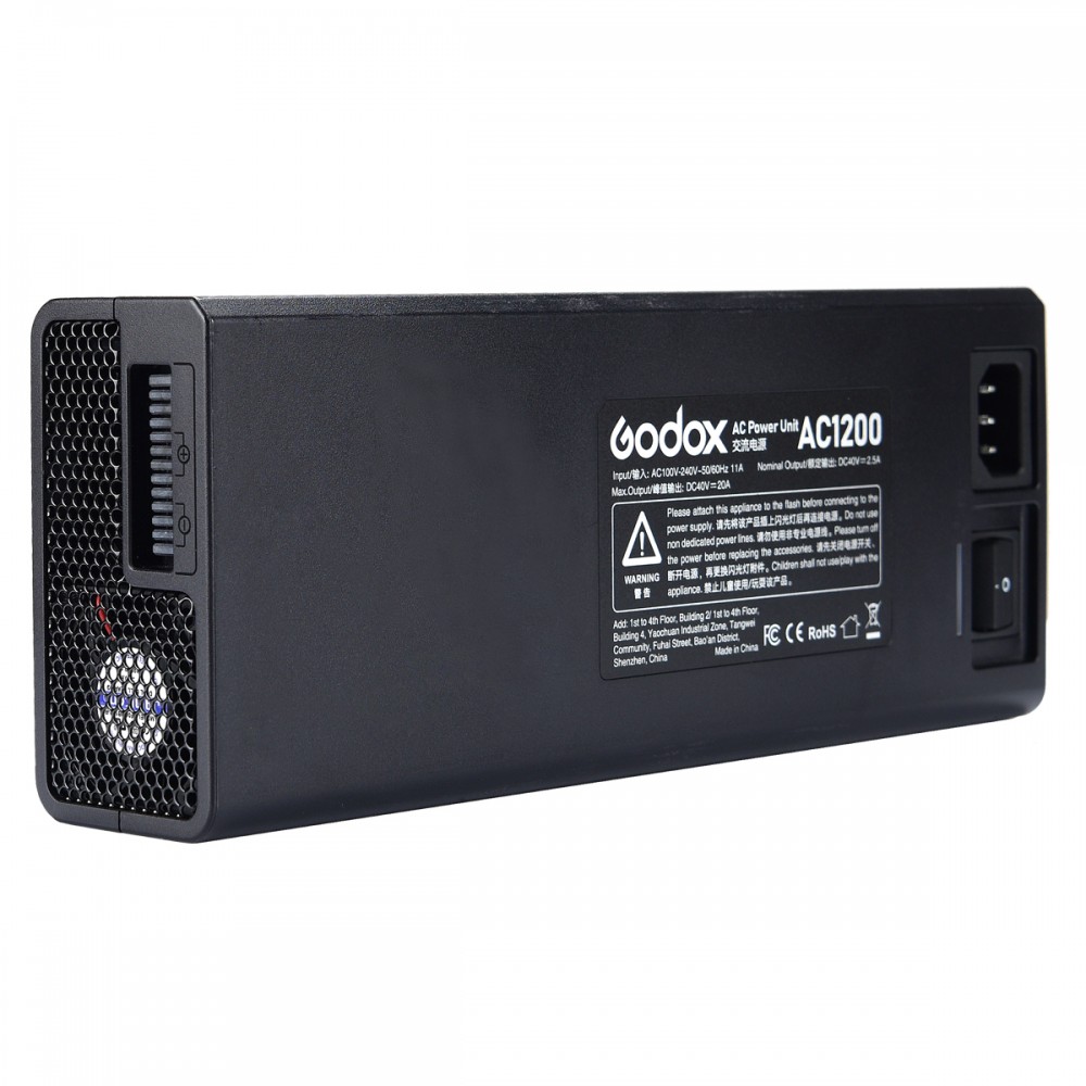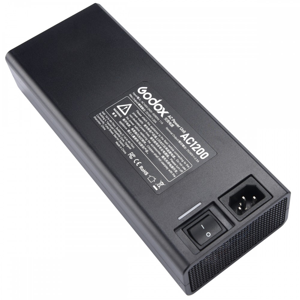 Godox AC adapter for the Godox Witstro AD1200 Pro TTL portable flash head. With this power adapter, you can supply the flash with continuous power from the mains, ideal for shooting in the studio or at locations where AC power is readily available. The power adapter has a wide voltage range of 100 to 240 volts where you can use it worldwide without any problems.