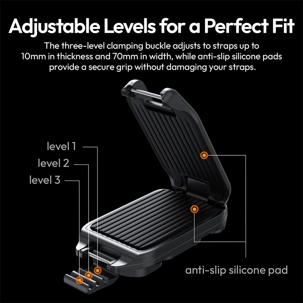 A rögzítő párnázott, csúszásmentes felülettel rendelkezik, amely stabilan tartja a kamerát, miközben kényelmes viseletet biztosít a hátizsák pántján vagy az övön. Az állítható rögzítés lehetővé teszi, hogy különböző vastagságú pántokra is könnyedén felszerelhesd.
