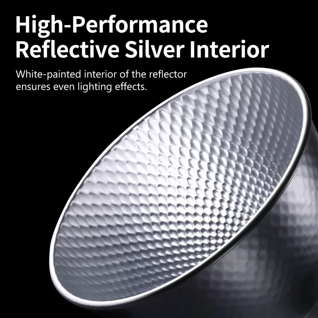 Ez a Ulanzi HT002 Bowens reflexor (kb. 18 cm átmérőjű), standard Bowens csatlakozással rendelkezik, és kiválóan alkalmas stúdióvilágítás kiegészítőjeként. A belső oldal fényvisszaverő bevonattal van ellátva, így segít egyenletes fényt vetíteni a tárgyakra, míg a masszív alumínium konstrukció könnyű és tartós. Ideális választás fényformáló eszközhöz, ha fókuszált, kontrollált világítást szeretnél különféle felvételekhez.